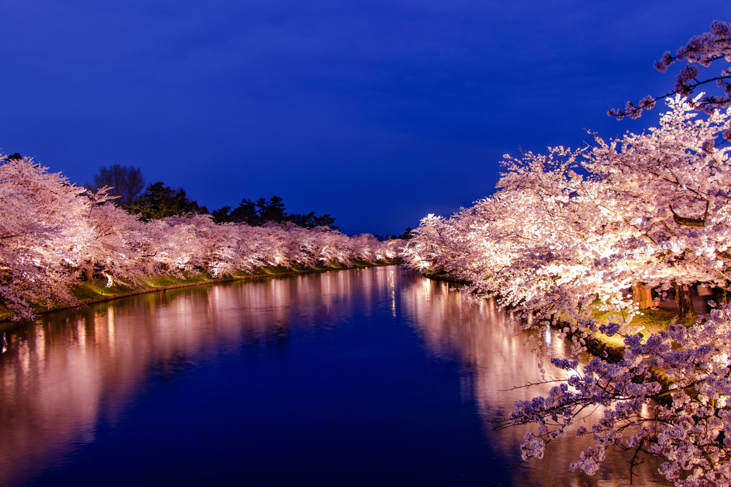 昼間はお城と桜、夜はライトアップされた幻想的な雰囲気を楽しめます。ボートに乗って堀から桜を見上げるのもおすすめです!